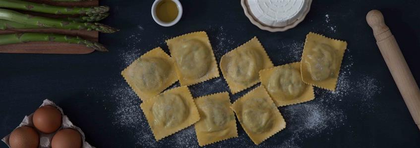 Gran Raviolo con Asparago Violetto d’Albenga - PRESIDIO SLOW FOOD - L’asparago violetto d’Albenga è un’esclusiva della nostra piana, e del suo habitat unico al mondo. Ha un sapore sapido ma delicato, grazie alla carnosità dei grossi turioni assolutamente non fibrosi.Le preparazioni più adatte sono quelle che ne esaltano la morbidezza e la “burrosità”.