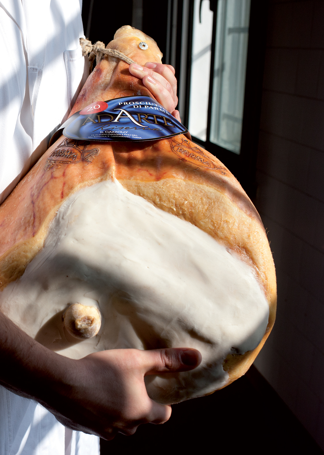 Crudo di Parma Addobbo con osso Kg. 11/12 - Crudo riserva. La selezione parte dalla pezzatura e dalle caratteristiche delle cosce fresche. Esperti le selezionano con cura e le destinano ad un ciclo di stagionatura prolungato a 20 mesi, affinato in apposite cantine.