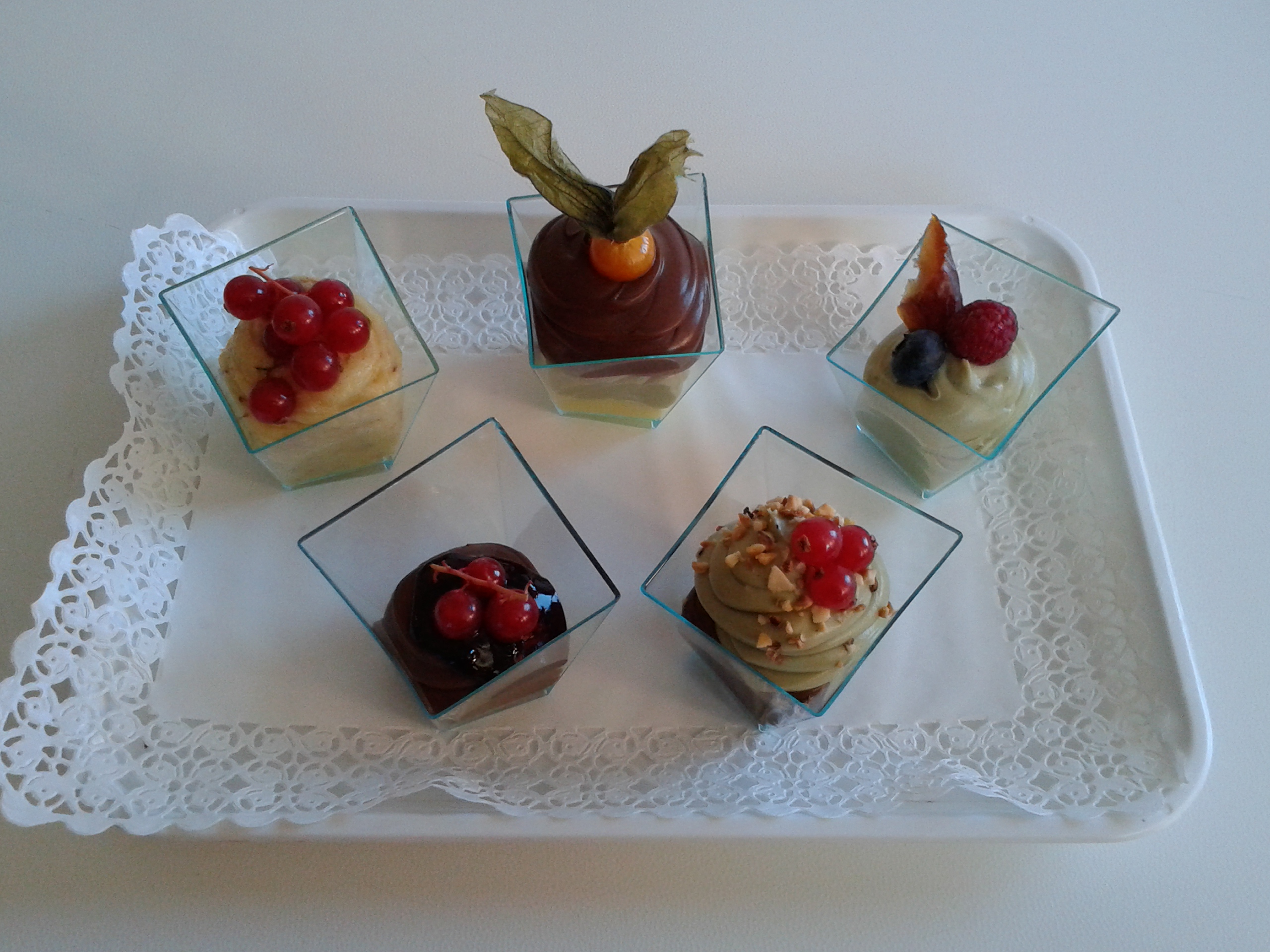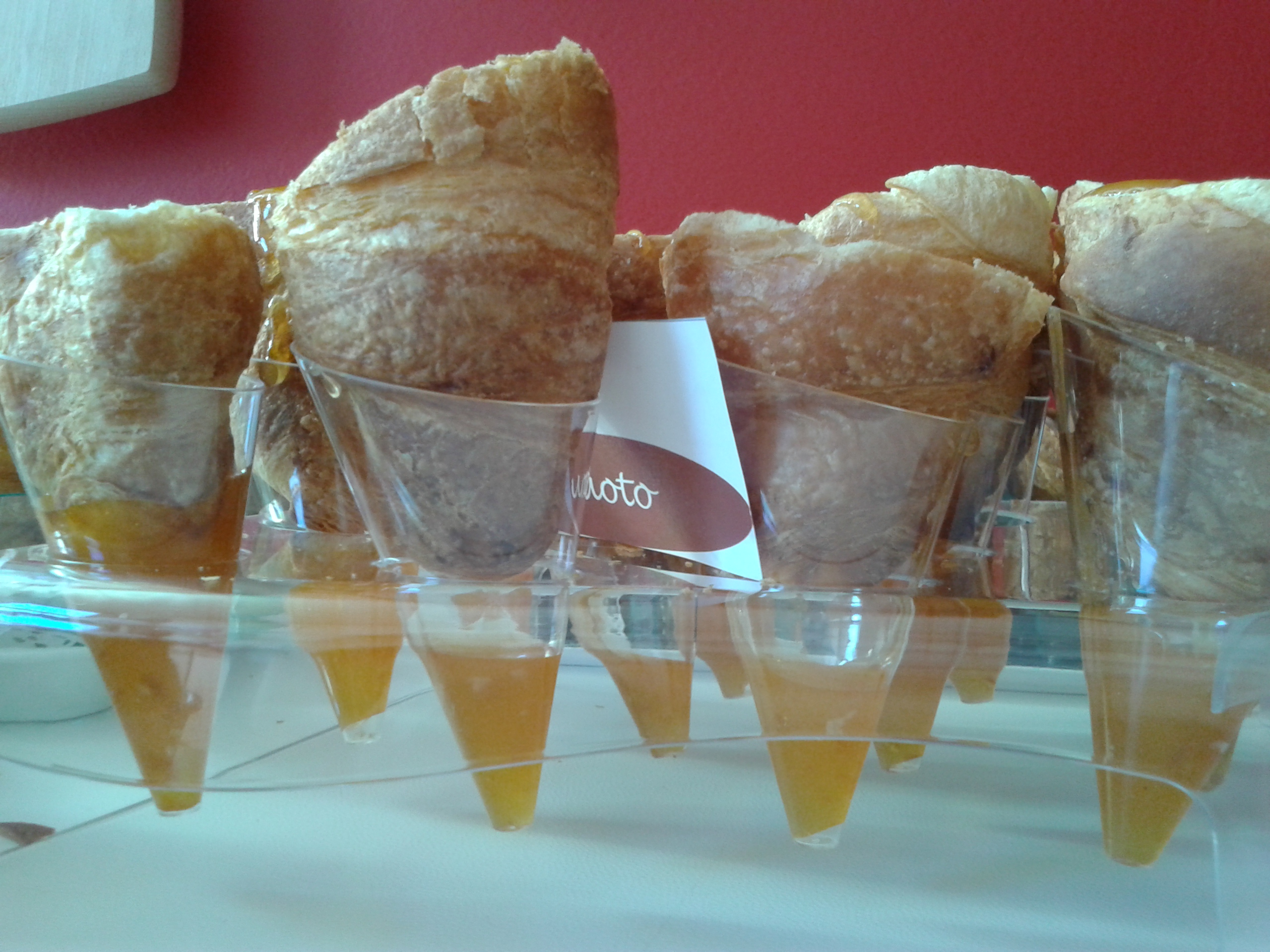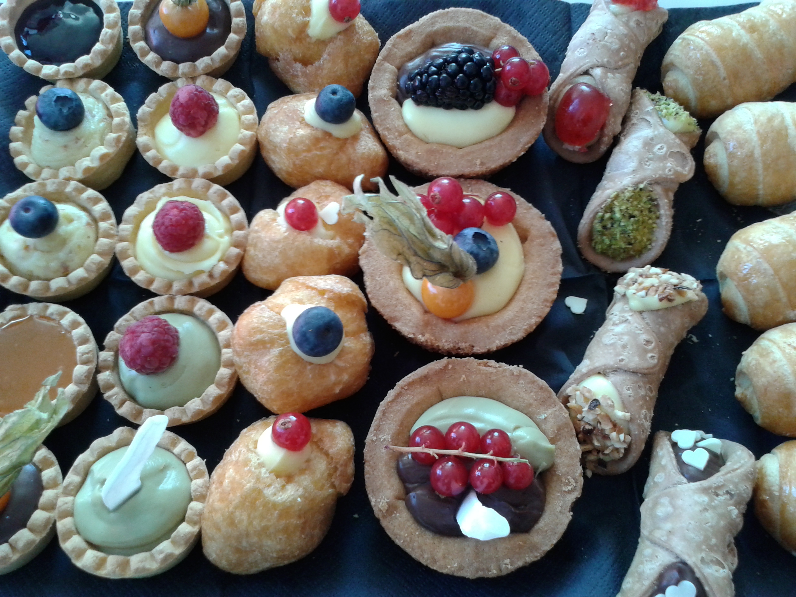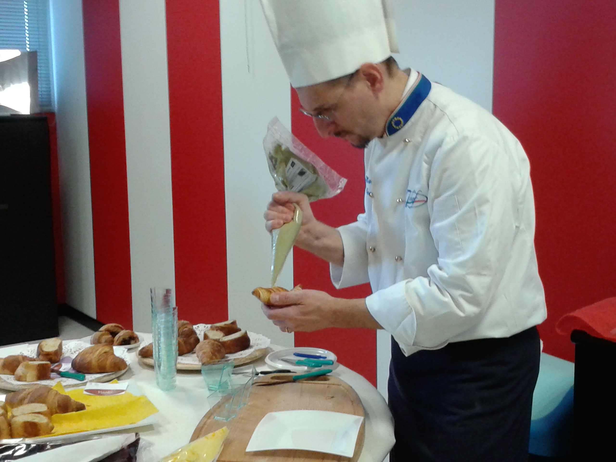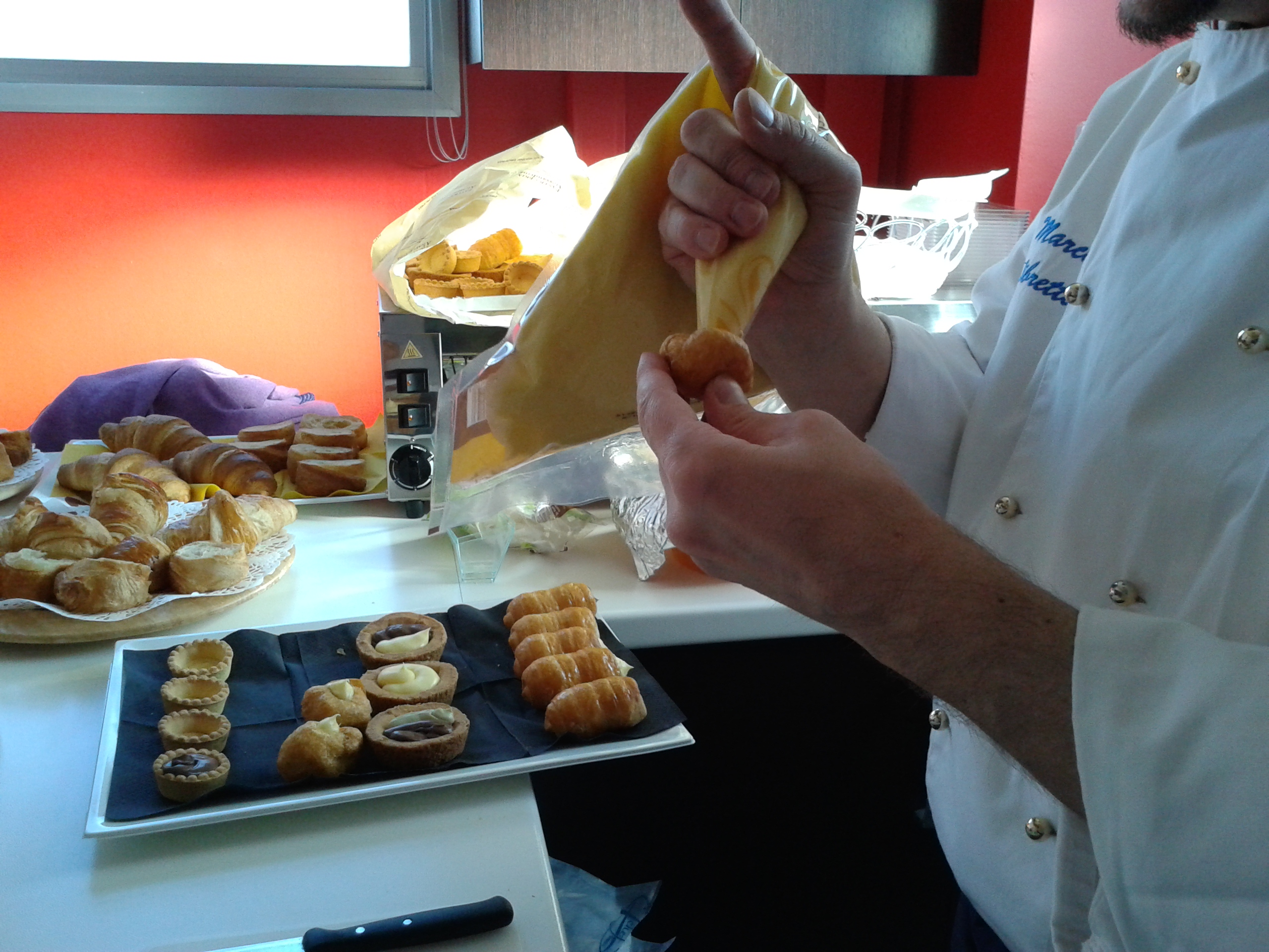 La signora Evelina, direttore vendite Italia, e Marco, il pasticcere, hanno tenuto una giornata di formazione e degustazione dei loro prodotti ai nostri agenti. Marco il pasticcere, è arrivato nel primo pomeriggio e si è appropriato subito della nostra cucina. Come un prestigiatore che dal cilindro tira fuori cose magiche, Marco da ogni borsa ha tirato fuori un intero laboratorio di pasticceria: sac à poche, taglieri, cucchiaini, bicchierini, e diversi strumentini che neanche conoscevamo; frolle vuote, cannoncini, tortelli e cannoli vuoti; in più per le decorazioni: frutti di bosco, datteri, granella di nocciole, cocco disidratato, gocce di cioccolato…insomma, la cucina si è trasformata! Marco si mette all’opera ed il profumo delle nostre brioches ha iniziato a mescolarsi a quello delle creme: la pasticcera classica, quella al cioccolato, al pistacchio, la frangipane, quella ai frutti di bosco e quella all’ albicocca. Impossibile resistere a tutte queste dolcezze! Con maestria, estro e fantasia, Marco utilizza le creme per farcire le brioches; per farcire tartelle di frolla, cannoli e cannoncini che poi ha posto in vassoi di piccola pasticceria; per riempire bicchierini – in gergo da pasticcere Shortini –con strati di creme di colore diverso guarniti con frutti rossi e granelle di nocciole e creando cosi tanti piccoli dessert. Uno spettacolo!