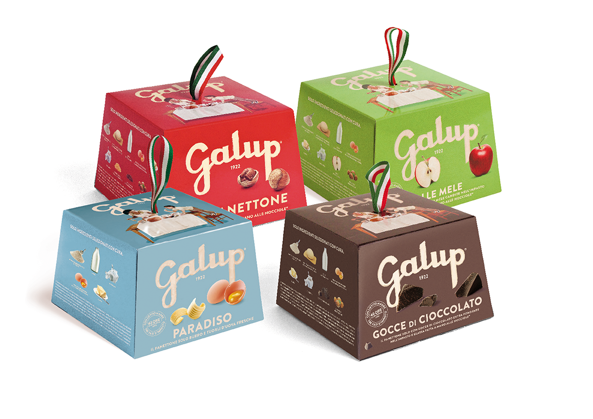 Presente in Italia dal 1922, la Galup propone una vasta gamma di panettoni di vario tipo e gusto, preparati con ingredienti di altissima qualità. 40 ore di lievitazione compresa quella “a testa in giù” che permette di far gonfiare bene il dolce, una lavorazione semi-artigianale, una glassatura fatta solo con Nocciola del Piemonte IGP e una serie di ingredienti particolari come cioccolato, frutta candita, crema al gianduia per completare le dolci delizie che vengono sfornante ogni giorno.
