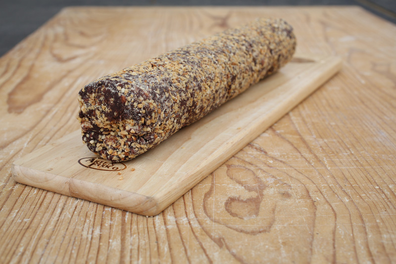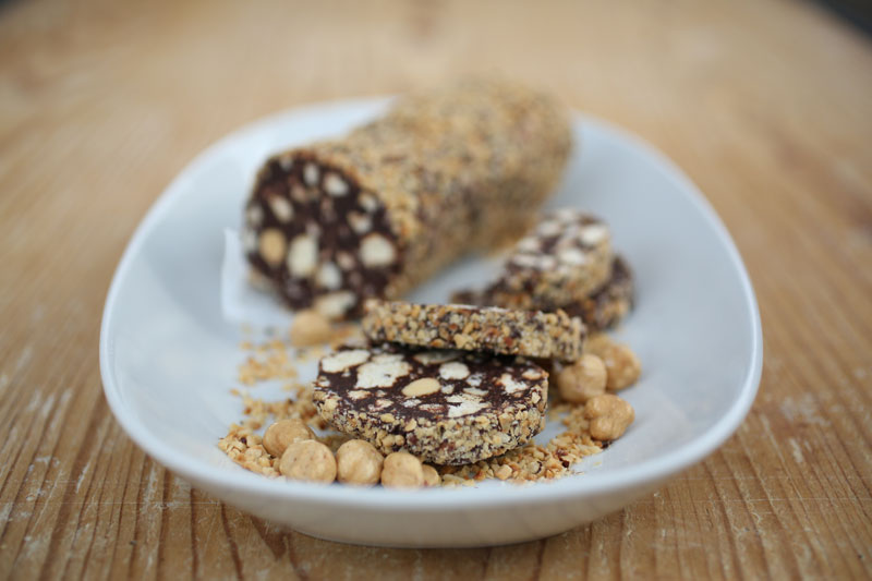 - il Salame al Cioccolato alle Nocciole: l’impasto base è quello del salame al cioccolato classico, nel quale vengono aggiunte nocciole intere del Piemonte al posto degli amaretti, che dona al dessert un gusto deciso.