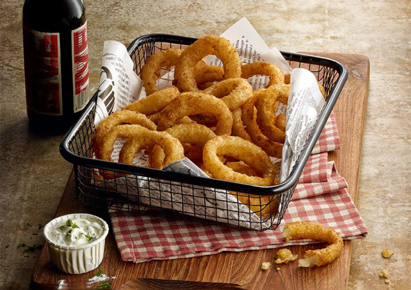 - Anelli di cipolla pastellati alla birra: Un anello naturale (e non un trito ricomposto) che dà il meglio di sé in forno o in friggitrice, con una pastellatura importante aromatizzata alla birra: non si può resistere. Provatela assieme all’hamburger.