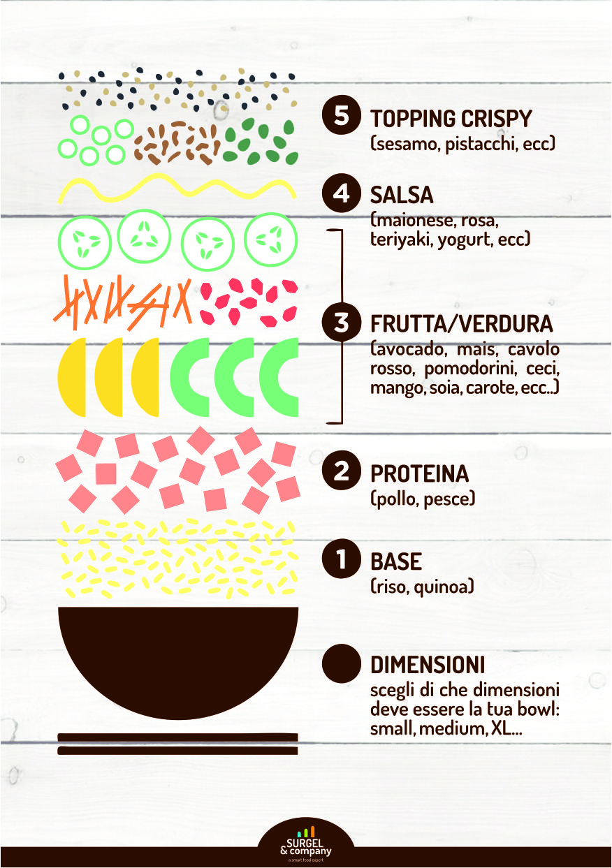 Ai locali che serviamo, gli agenti Surgel Company offrono tutti gli ingredienti necessari per una soluzione pratica e veloce, a partire dal riso bianco precotto, pronto da scaldare al microonde.Quindi le proteine: salmone affumicato, gamberetti, tonno, tagliata e cuoricini di pollo.E poi le verdure e le salse. Infine l'apporto di croccantezza per il topping: arachidi e cipolla croccante.Assemblare il tutto è un attimo (meno di 3 minuti). Ed è possibile proporre differenti ricette, a base di pesce, carne o in versione vegetariana.