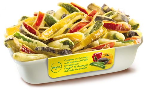 Ci sono poi le verdure PASTELLATE: una croccante pastella avvolge zucchine, melanzane, peperoni, cipolle, carote, tutte a bastoncino, per un contorno pronto in pochi minuti di forno ventilato, oppure gli anelli di cipolla e di peperone per un contorno alternativo legato alla ristorazione serale.