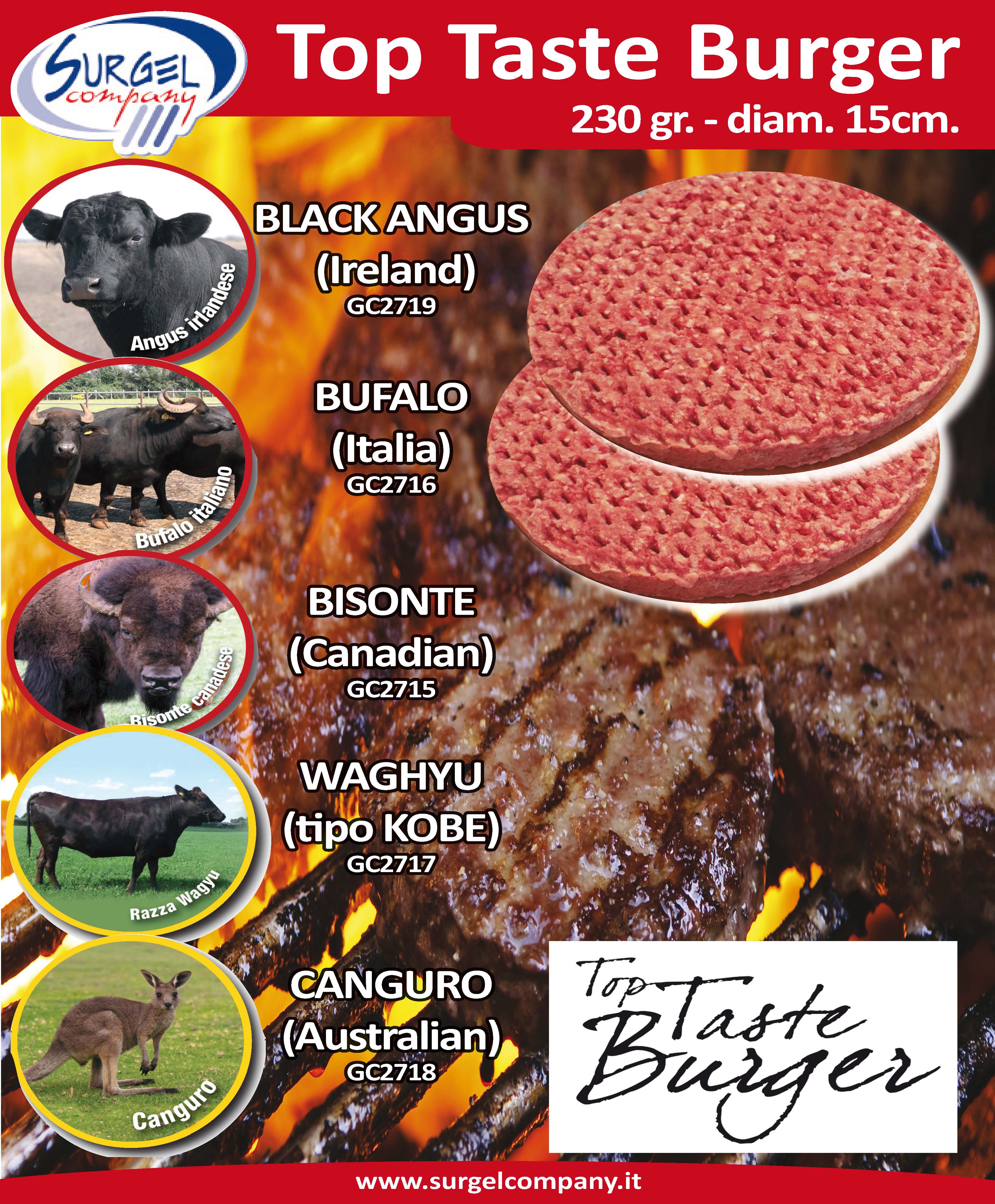 Hamburger di ANGUS Irlandese. Hamburger di BUFALO Italiano. Hamburger di CANGURO Australiano. Hamburger di WAGYU Italiano, tipo Kobe. Hamburger di BISONTE Canadese.