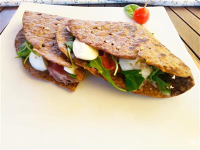 La piadina che trattiamo, per la sua elasticità viene chiamata“arrotolosa” e in effetti si presta ad essere arrotolata con facilità senza che si rompa.