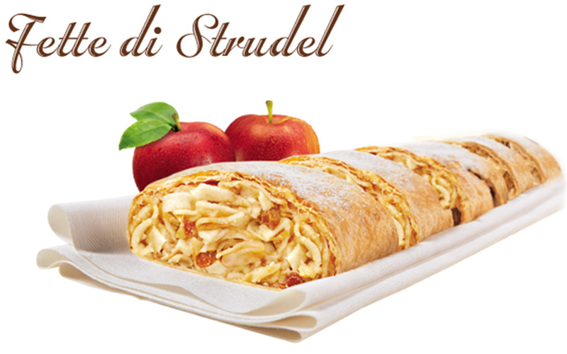 FETTE DI STRUDEL TIROLESE GR.160 Imponenti porzioni di strudel a fette, con mele, cannelle e uvetta. Un sottile strato di pasta sfoglia racchiude il tutto. Buono e micoondabile e' da servire tiepido, con crema calda o una pallina di gelato.