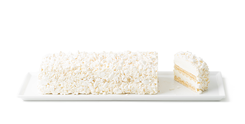 Meringata trancio lunga - Una spettacolare Meringata proposta nella versione a trancio. Due strati di friabile meringa farciti con crema semifreddo al latte e panna, decorati con granella di meringa. Un dolce fresco ed elegante, ottimo come proposta per il fine cena!