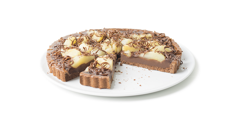 Crostata Pere e Cioccolato - Le proprietà benefiche delle pere che contengono calcio e fibre, abbinate alla crema al cacao regalano gusto ed energia. Una torta a base di pasta frolla e plum cake, ricca di pere sciroppate e cacao, decorata con righe di salsa al cacao e scaglie di cioccolato bianco e nero!